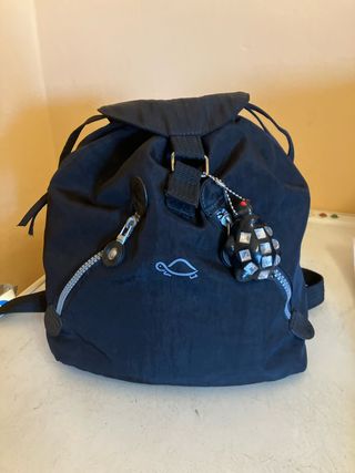 Zainetto Carpisa in tessuto blu scuro, con un simpatico ciondolo a forma di tartaruga. - Chiusura principale con coulisse e patta. - Tasca frontale con zip. - Spallacci regolabili.