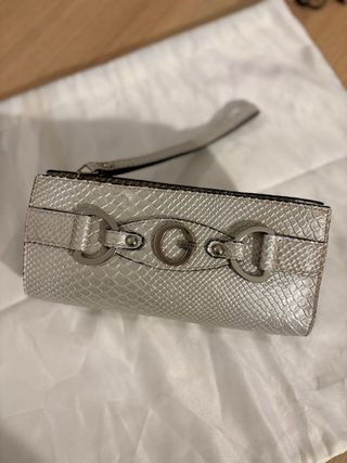 Elegante pochette Guess con finitura effetto pitone. - Colore argento metallizzato. - Dettagli con anelli e logo Guess. - Include un cinturino da polso.