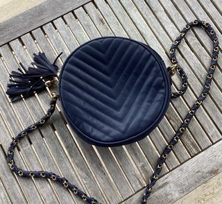 Elegante borsetta rotonda con un design trapuntato a V. La tracolla è una catena intrecciata con dettagli dorati. Presenta anche un grazioso dettaglio di frange.Molto simile al modello Saint Lauren .Metallo e similpelle - Forma rotonda - Dettaglio frange - Tracolla a catena intrecciata