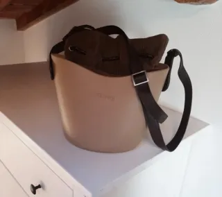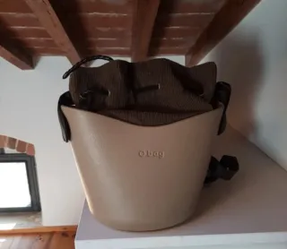 Borsa a secchiello O bag con interno in tessuto a coste marrone. - Corpo borsa in materiale beige. - Interno in tessuto marrone a coste. - Chiusura con coulisse.
