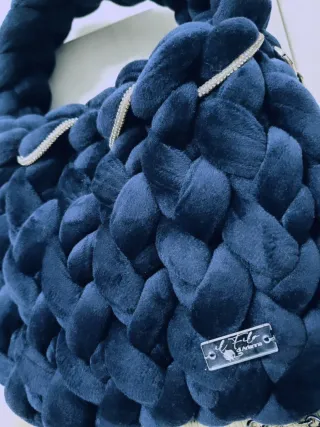 Borsa a mano in velluto blu navy, con manico intrecciato e tracolla a catena. Intreccio a canestro. - Design chunky e moderno. - Finitura in velluto morbido. - Dettaglio filato con strass intrecciato. - Tracolla a catena argentata rimovibile. - Chiusura mediante bottoncino automatico. - Targhetta personalizzata in acrilico MISURE IN CM: 25L 22A