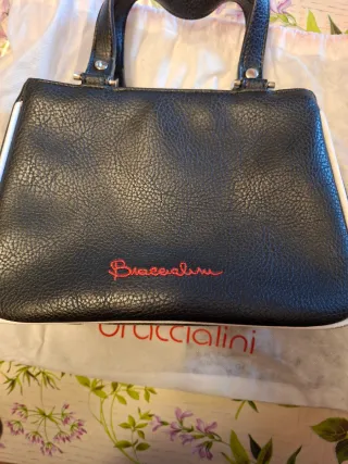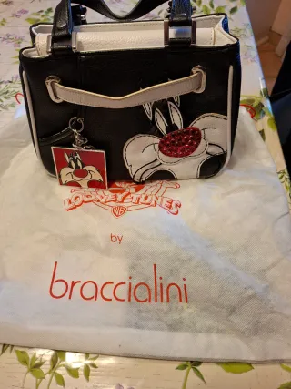 Borsa a mano Braccialini con personaggio Looney Tunes. - Design bicolore nero e bianco. - Dettagli con strass rossi. - Charm a tema Sylvester. - Sacca antipolvere inclusa. Misure 25cmlarghezza x17cmaltezza x 10cm profondità