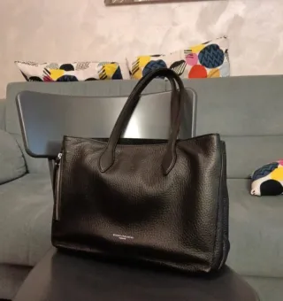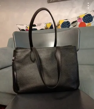 🇮🇹 Borsa nera in similpelle usata poco ma con qualche difetto visibile in foto, soprattutto sulla tracolla lunga amovibile. Con tracolla lunga, manici corti e numerosi scomparti interni oltre che tasca esterna. 🇪🇸 Bolso negro de piel sintética, con poco uso, pero con algunos defectos visibles en las fotos, especialmente en la bandolera larga extraíble. Con bandolera larga, asas cortas y numerosos compartimentos interiores, además de un bolsillo exterior.