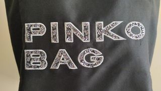 Borsa tote nera con logo PINKO BAG ricamato con paillettes, logo PINKO BAG frontale, dettagli in paillettes argentate.