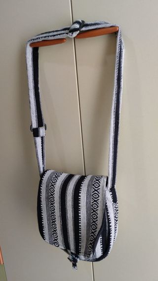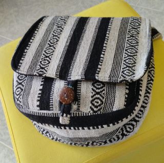 Borsa a tracolla etnica con un design a righe bianco e nero, realizzata a mano, in lana e cotone, chiusura con bottoncino.