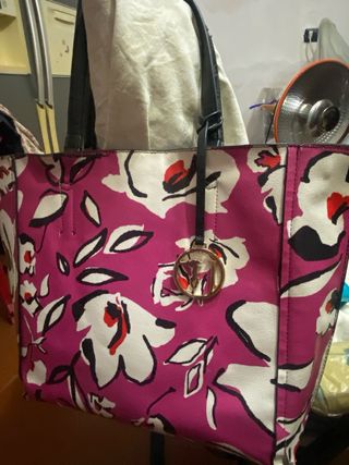 Borsa Trussardi double-face con un vivace motivo floreale usure ai manici e vedi foto - Design reversibile. - Dettagli in oro. - Fantasia floreale rosa e bianca.