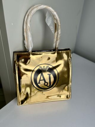 Borsa a mano con finitura metallizzata lucida. - Logo circolare nero con aquila e sigla AJ. - Manici superiori rivestiti. - Dettagli dorati.