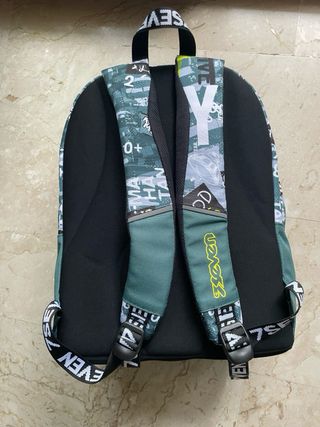 Zaino Seven originale capiente con 3 tasche centrali e una esterna, ideale per organizzare al meglio libri e PC. Presenta uno schienale imbottito e un design moderno con dettagli fluo, perfetto per scuola e tempo libero. Il capo è in ottime condizioni, con cerniere resistenti e perfettamente funzionanti.