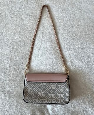 Elegante borsa a tracolla con una combinazione di colori rosa e beige. Presenta una tracolla a catena. - Design con logo all-over. - Chiusura a patta. - Tracolla a catena color oro.