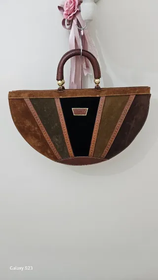 Borsa in stile Rode, un pezzo unico che evoca gli anni '80. Realizzata con una combinazione di pelle e camoscio, presenta un design a ventaglio con pannelli di diversi colori.con borchie in metalli dorati misure altezza 24 cm larghezza 43 cm profonduta 10 condizioni ottime pari a nuova - Materiali: pelle e camoscio - Dettagli a contrasto - Manico arrotondato in pelle