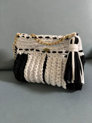 Borsa fatta a mano all'uncinetto con fettuccia. - Design bicolore bianco e nero. - Dettagli con catena dorata. - Pompon decorativo. - Nuova, mai usata.
