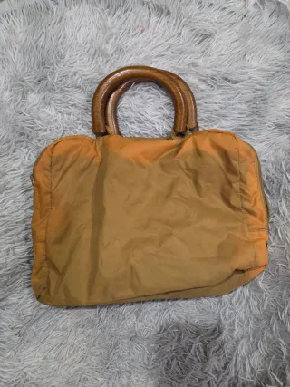Borsa Prada in pelle con manici in legno. Nessuna rottura ma scolorita