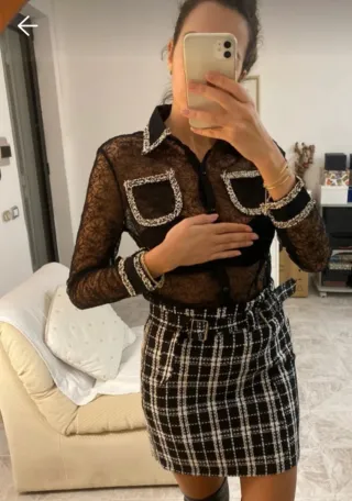 Elegante completo composto da camicia e gonna. - Camicia in pizzo trasparente con dettagli. Tg U - Gonna a vita alta con fantasia a quadri e cintura, in tweed, tg 44