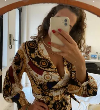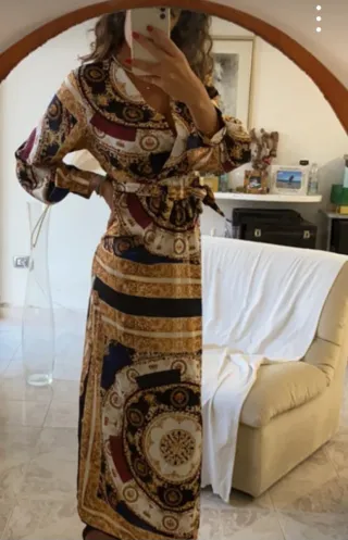 Elegante vestito lungo con una fantasia unica e vivace. Perfetto per ogni occasione. - Scollo a V. - Maniche lunghe. - Cintura in vita per un fit personalizzato. - Tessuto leggero e fluido. Taglia M. Mai usato Scarpe nere con cinturino e tacco quadrato nero.41. Ottimo stato