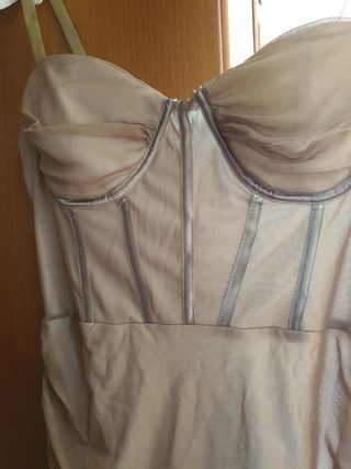 Vestitino attuale con un design elasticizzato che si adatta comodamente. - Tessuto leggero e drappeggiato. - Dettagli a corsetto sul busto. - Spalline sottili regolabili.