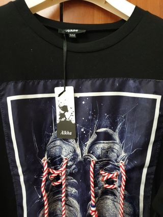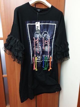 Vestito stile over con dettagli in organza e stampa. - Maniche corte con volant in organza. - Stampa frontale con scarpe e lacci colorati. - Etichetta del brand presente.