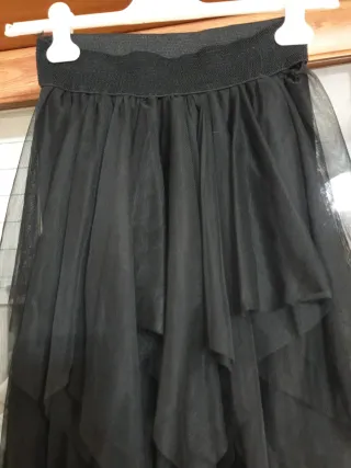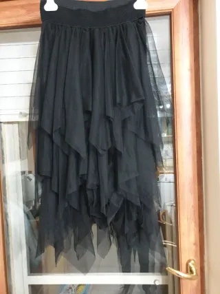 Gonna lunga in tessuto leggero con elastico in vita. - Design a balze sovrapposte. - Orlo asimmetrico e sfrangiato. - Tessuto trasparente effetto tulle.