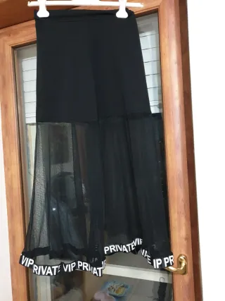 Gonna lunga con dettagli trasparenti e scritta Private Vip sul fondo. - Parte superiore in tessuto coprente. - Fondo in tessuto trasparente. - Fascia con logo Private Vip sul bordo inferiore.