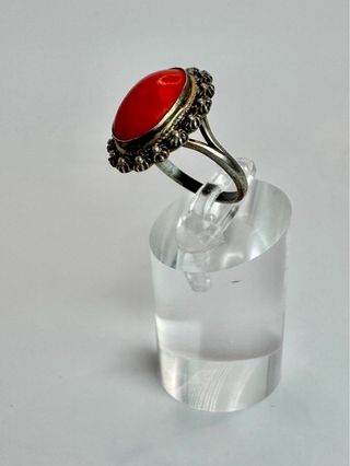 Anello vintage realizzato in argento 800, lavorazione sarda e cabochon di corallo rosso (naturale, non è imitazione). Le condizioni sono buone, piccoli segni di età. Misura 16.5 italiana