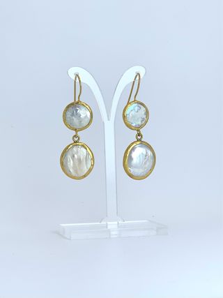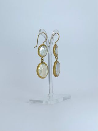 Orecchini realizzati in montatura color oro (particolare molto anche l’incisione) e perle di acqua dolce barocche tonde. Le condizioni sono buone, piccoli segni di età. Lunghezza: 53 mm Peso: 6.77 grammi