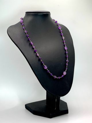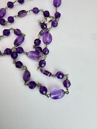 Collana fine in ametista viola (una qualità alta ed è molto bella) con montatura in argento 925 timbrata. Le condizioni sono molto buone, piccoli segni di età. Lunghezza: 44 cm