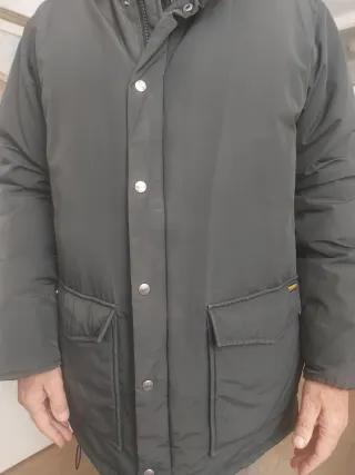 Giaccone con cappuccio bordato in pelliccia. - Chiusura con cerniera e bottoni. - Tasche frontali. - Logo del marchio sul colletto. -Piccole macchie su tasca e maniche, sempre lavato in lavasecco ma purtroppo macchie non sono venute e non si può lavare ad acqua perché si rovinerebbe pelo