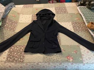 Giacca elegante e sportiva, perfetta per ogni occasione. - Tessuto morbido e confortevole effetto leggermente delave’ - Design con cappuccio integrato foderato con tessuto tipo sangallo. - Chiusura con bottoni. - Tasche frontali applicate.
