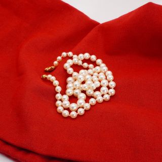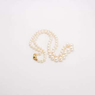 Bellissima collana di perle di acqua salata Akoya molto luminose e di un bel colore bianco leggermente tendente al champagne che partono a scalare. Il diametro minimo vicino alla chiusura è di 5 mm e nella parte centrale è di 9 mm. La chiusura è in oro giallo timbrata 750. Lunghezza : 56 cm Peso: 26.79 grammi