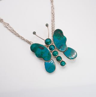 Collana/Spilla e catena realizzate in turchese e argento 925. Il ciondolo/spilla è a forma di farfalla ed è stato realizzato in Messico da maestri orafi che sono rinomati per la loro manualità nella lavorazione dell'argento. il timbro presente è 950. La catena aggiunta ha una lunghezza di 83.5 cm e si può indossare girata due volte intorno al collo. Da notare la particolare lavorazione. Le condizioni di età generali sono buone. Faccio presente che la farfalla presenta delle imperfezioni sulla pietra (alla sinistra sopra, alla destra sotto due-da guardare le foto 3 e 4. Dimensioni farfalla: 65 mm x 50 mm peso: 34.55 grammi