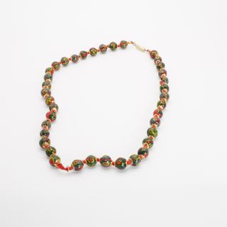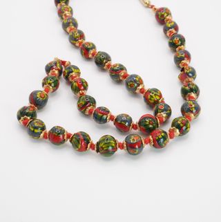 Collana originale veneziana con murrine tonalità calde di verde e rosso. Montatura ed elementi in metallo color oro. Da notare che in un punto una sfera di Murano manca. Lunghezza girocollo.