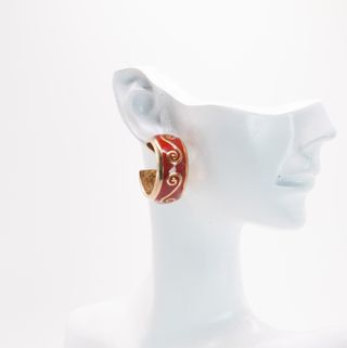 Orecchini vintage colore oro giallo con smalti a fuoco color rosso e decorazioni dorate. Presente il timbro degli orecchini sul ago, non riesco capire se è argento timbrato 925 o 800. Le condizioni sono molto buone, articolo di altissima qualità realizzato in gioielleria. 22 mm diametro del cerchio.