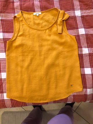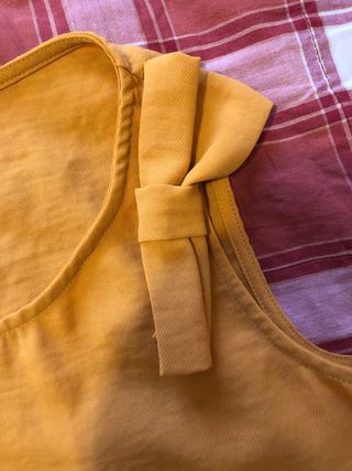 Canotta Kocca di colore senape, perfetta per l'estate. - Modello senza maniche. - Dettaglio fiocco sulle spalle. - Orlo arrotondato.