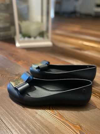 ballerine in gomma, con leggera profumazione fiocco in gomma con applicazione in metallo taglia 38 usate poco perche vestono piccolo