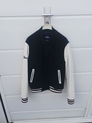 Giubbino stile college Superdry. - Maniche bianche. - Corpo nero. - Polsini e colletto a costine con strisce. - Chiusura con bottoni a pressione.