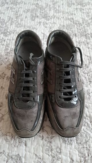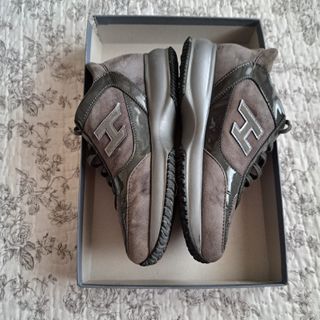 Scarpe Hogan da donna in tonalità grigia in ottimo stato con scatola originale - Inserti in vernice lucida. - Tomaia in camoscio. - Chiusura con lacci.