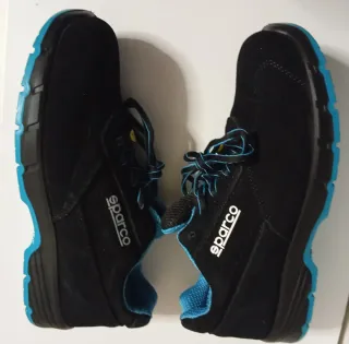 Scarpe antinfortunistiche Sparco. - Tomaia in pelle scamosciata. - Suola in gomma. - Inserti in colore blu.