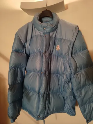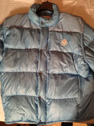 Piumino Moncler di colore turchese - Logo Moncler sul petto. - Chiusura con bottoni a pressione. - Collo alto. - condizioni ottime, manca logo sul cursore. - possibile togliere le maniche. -anni 70/80 originale.