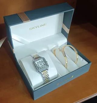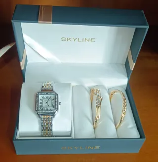 Elegante set regalo del marchio Skyline. Orologio con design rettangolare e dettagli brillanti. Due braccialetti abbinati con incastonature. Combinazione di toni dorati e argentati.