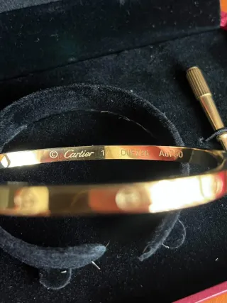 Bracciale della celebre collezione Love di Cartier. Design in tonalità dorate. Include scatola originale, busta per l'acquisto, certificato e custodia. Utensile per la regolazione incluso.