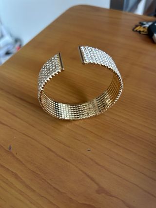 Elegante bracciale rigido da donna, perfetto per aggiungere un tocco di luce al tuo look. - Design a fascia con molteplici file di strass scintillanti. - Finitura color oro. - Struttura a taglio aperto per una facile indossabilità.