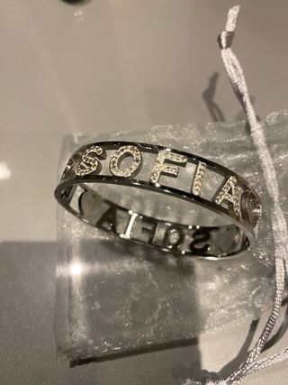 Elegante bracciale da donna con nome SOFIA inciso e decorato con strass scintillanti. Un accessorio raffinato per aggiungere un tocco di luce al tuo stile. - Design a fascia aperta. - Lettere SOFIA traforate. - Dettagli a forma di cuore all'interno.