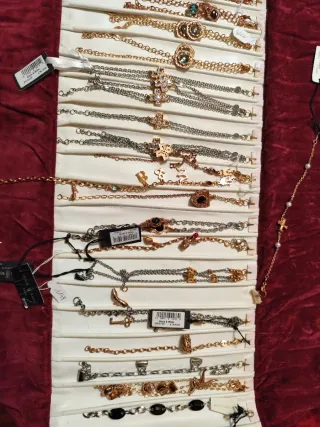 Set di bracciali e cavigliere da donna. - Design a catena. - Dettagli con pietre colorate. - Elementi decorativi a forma di croce. - Charm a forma di stella. - Iniziali B e M. 35 euro l'uno già scontati vedere prezzo cartellino iniziale
