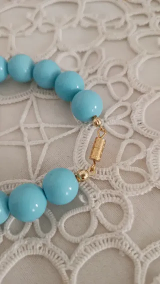 Bracciale donna realizzato con perle in impasto di turchese, nuovo, chiusura con susta ad avvitamento in metallo colore oro. Lunghezza bracciale cm. 20,5