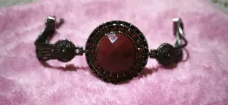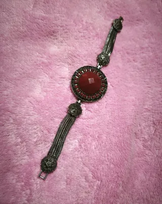 Bracciale elegante da donna con un design accattivante. - Presenta una pietra centrale di colore rosso. - Dettagli metallici in tonalità argentata. - Realizzato con una catena sottile e ornamenti circolari.