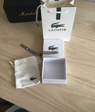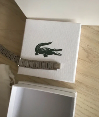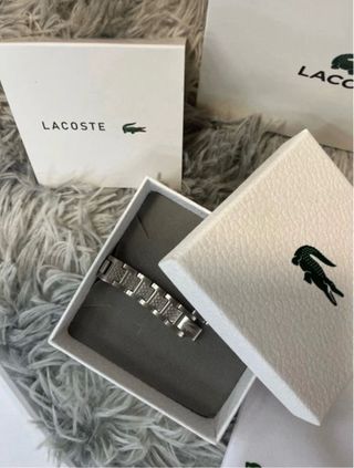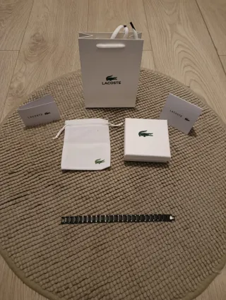 Elegante bracciale da uomo Lacoste. - Design moderno con elementi neri e argentati. - Include sacchetto porta gioielli e scatola originale.