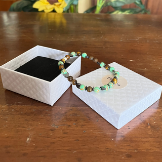 Pietre naturali da 6 mm montate su elastico resistente, comodo e duraturo. Il bracciale combina howlite verde, occhio di tigre e spaziatori in ematite, con chiusura centrale sempre in ematite per un look elegante e moderno. Le misure sono indicative (≈) e il bracciale è dotato di elastico resistente, per una vestibilità comoda. Uomo: S ≈ 16–17 cm M ≈ 18–19 cm L ≈ 20–21 cm XL ≈ 22–23 cm Scatolina regalo inclusa 🎁 Prezzo non trattabile, grazie per la comprensione 🙏 #braccialeuomo #bracelethomme #armbandherr #pulserahombre #pulseiramasculina #pietrenaturali