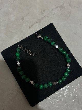 Elegante bracciale da uomo realizzato in acciaio inossidabile. Presenta perle verdi con un design a strisce nere e dettagli metallici esagonali. - Perle in malachite. - Chiusura a moschettone.