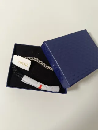 Elegante bracciale da uomo Fossil, un accessorio che aggiunge un tocco di stile. - Design intrecciato con cordino nero. - Dettagli in catena color argento. - Chiusura a scatto in metallo.