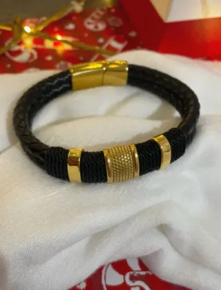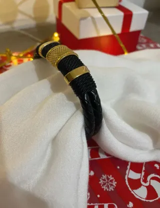 Elegante bracciale da uomo realizzato in pelle intrecciata con dettagli dorati. - Design moderno e raffinato. - Materiali di qualità.
