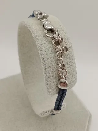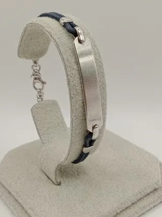 Strepitoso braccialetto unisex con placca ed elementi di giunzione in argento 925 mentre il restante realizzato in un elegante cordino blu scuro, chiamato anche corda nautica. Maglia ovale finale che funge da estensione. Misura da 18 a 21 cm. In vendita su altre piattaforme online